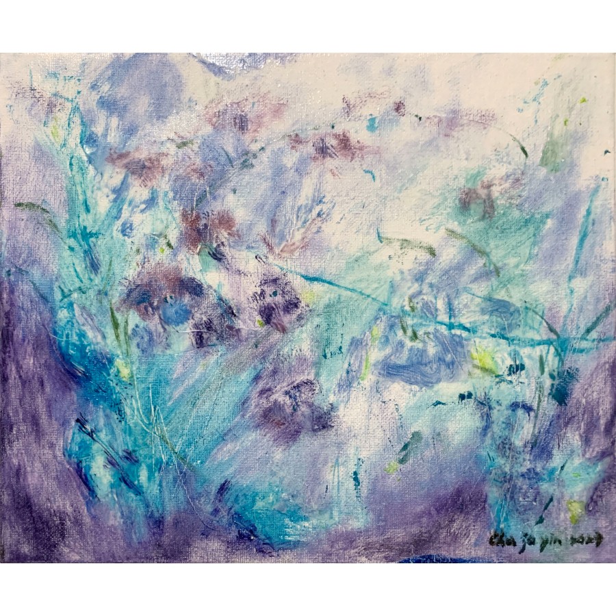 朱若茵畢業於台灣藝術大學美術系,作品風格介於印象與抽象之間,擅長以充滿生命力的大自然結合內在感受表現富含詩意的畫面,繁盛的花草在她筆下彷彿聞見清香,巍峨的山與湛藍的海則是表現她沉寂的心境,而溫潤的土地則是她描繪記憶中關於家鄉的樣貌,她用畫筆對話自然,邀請我們賞析生命。